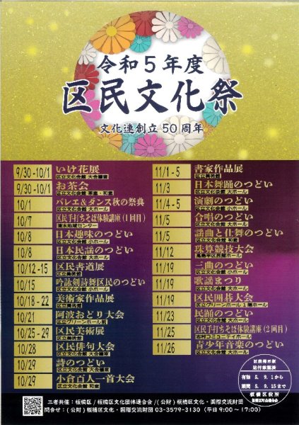 category Narrow by area Akatsuka Area Itabashi Area Shimura Area Takashimadaira Area Tokiwadai Area Narrow down your search by these criteria previous month this month following month Events in October 2023 2023 Ward Citizens' Cultural Festival The Ward Citizens' Cultural Festival, the largest festival of culture and art in the ward, will be held again this year. We are sincerely looking forward to seeing you at the festival. Date & Time:September 30, 2023 - November 26, 2023 Read more Itabashi sijyo matsuri 市場まつりについては、新型コロナウイルス感染症の影響により、令和2年度から開催を休止・縮小しておりましたが、今年度は、5か所の東京都中央卸売市場において、市場まつりを開催することとなりました。 板橋市場においては、約4年ぶりの開催となります。 都民の方へ卸売市場と生鮮食料品に関する理解を深めていただくとともに、食生活の向上や食育・花育の普及などを目的に、市場を開放する特別なイベントです。 是非、ご家族やご友人をお誘いあわせの上お越しください。 多くの皆様のご来場をお待ちしております。 Date & Time:2023年10月29日(日曜日)8時45分から11時30分まで Read more
