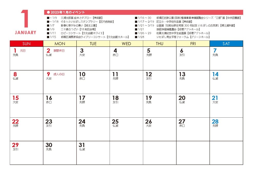 Each month contains information on events and major events in Itabashi Ward, making this calendar convenient and easy to use.