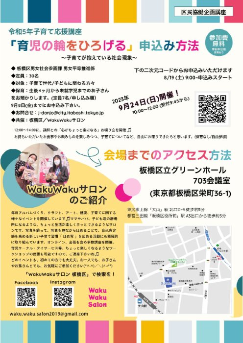 | WEB | Itabashi Ward, Tokyo, Japan https://www.city.itabashi.tokyo.jp/tetsuduki/jinken/danjo/kouza/1047430.html Application https://www.shinsei.elg-front.jp/tokyo2/uketsuke/form.do?id=1689146047318 |