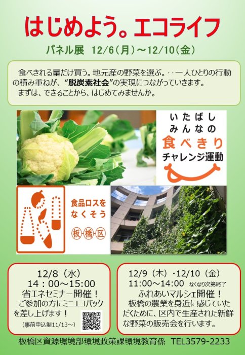 | Contents | The theme of the event is "Ecology in Our Daily Lives," and there will be a panel display, the Itabashi Fureai Marche, and an energy-saving seminar. |