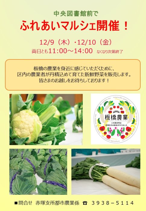 | Date and Time | December 6-10, 2021 *Energy-saving seminar on Wednesday, December 8, from 2 to 3 p.m., and Itabashi Fureai Marche on Thursday, December 9 and Friday, December 10, from 11 to 2 p.m. each day, until sold out. |