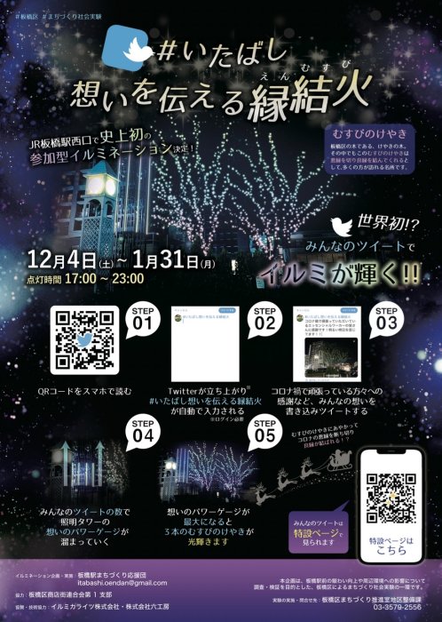 | Contents | The "Musubi no Keyaki", which is said to bring good luck, is illuminated in the plaza in front of Itabashi Station's West Exit. It is a participatory illumination event where the light changes in conjunction with Twitter. |