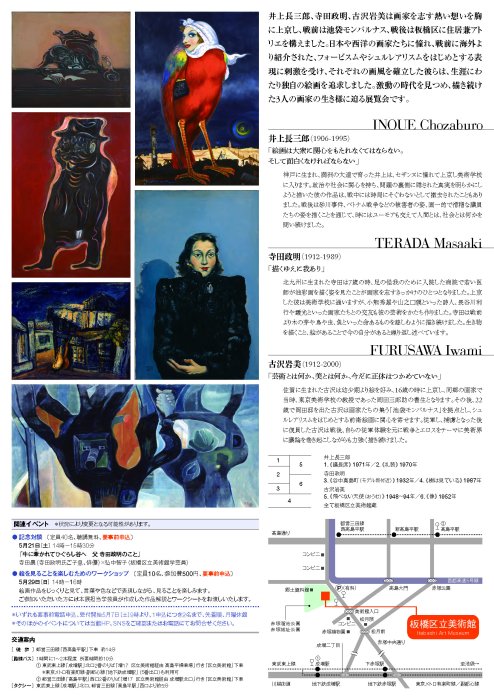 Chosaburo Inoue (1906-1995), Masaaki Terada (1912-1989), and Iwami Furusawa (1912-2000) moved to Tokyo with a burning desire to become painters. After the war, he set up his residence and studio in Itabashi Ward. They were inspired by Japanese and Western painters, as well as by Fauvism and Surrealism, which were introduced from overseas before the war, and established their own style of painting. This exhibition will explore the lives of these three painters, who continued to look at and paint in the turbulent times they lived in.