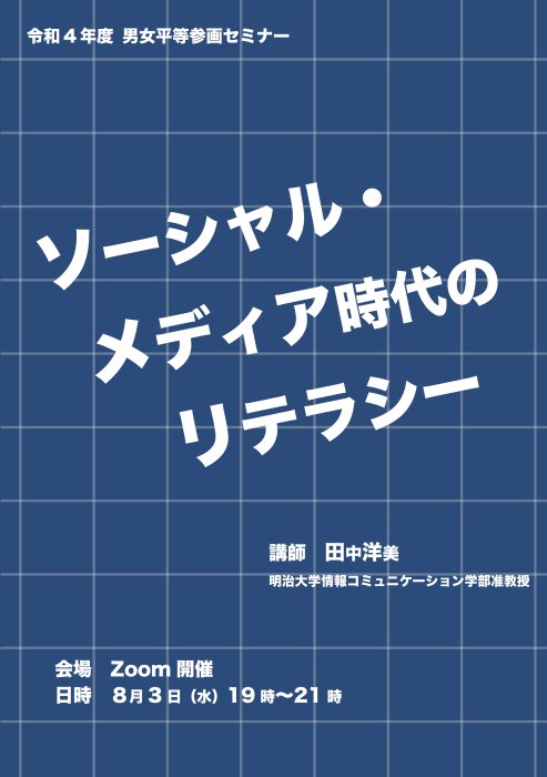 In this seminar, Ms. Hiromi Tanaka, a specialist in media and gender studies, will give a multifaceted explanation of the current state of social media use and points to note, providing an opportunity for participants to think about media literacy today.