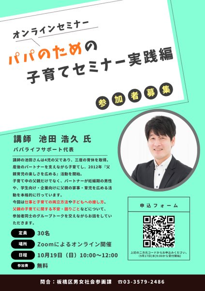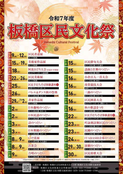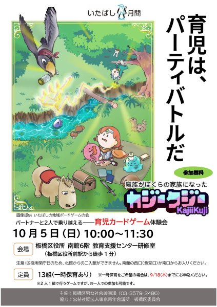 カテゴリー エリアで絞る 赤塚エリア 板橋エリア 志村エリア 高島平エリア 常盤台エリア この条件で絞る 前月 今月 翌月 2025年10月のイベント 育児カードゲーム「カジークジー」体験会 区と協働して男女平等参画に関する講座を企画・運営し、区民の皆さんに男女平等参画社会の大切さを広めていただける団体を募集します。 開催日時:令和7年10月5日(日)10時00分~11時30分 詳しく見る 令和7年度 板橋区民文化祭 毎年多くの方にご来場いただいている区内最大の文化・芸術の祭典「区民文化祭」が今年も開催されます。区内各所において絵画や書道、いけ花の展示、手打ちそば体験など、板橋の伝統文化や芸術に触れ合うことのできるイベントが行われます。皆さまのご来場を心よりお待ちしております。 開催日時:2025年10月9日~2025年11月30日 詳しく見る オンライン講座「子育てママの未来計画」受講者募集 オンライン講座「子育てママの未来計画」の受講者を募集します! 開催日時:A レジリエンス:令和7年10月2日・9日(木)/B 家政学入門編:令和7年10月16日・23日(木)※いずれも10時から11時30分 詳しく見る オンラインセミナー 「パパのための子育てセミナー実践編」 開催日時:10月23日(水)19時~21時 詳しく見る