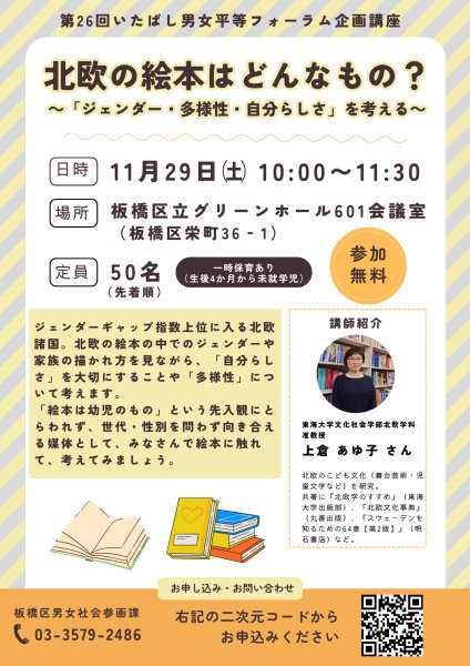 カテゴリー エリアで絞る 赤塚エリア 板橋エリア 志村エリア 高島平エリア 常盤台エリア この条件で絞る 前月 今月 翌月 2025年10月のイベント いたばし男女平等フォーラム企画講座 北欧の絵本はどんなもの?~「ジェンダー・多様性・自分らしさ」を考える~ 開催日時:2025年11月29日(土)10時~11時30分 詳しく見る 令和7年度 板橋区民文化祭 毎年多くの方にご来場いただいている区内最大の文化・芸術の祭典「区民文化祭」が今年も開催されます。区内各所において絵画や書道、いけ花の展示、手打ちそば体験など、板橋の伝統文化や芸術に触れ合うことのできるイベントが行われます。皆さまのご来場を心よりお待ちしております。 開催日時:2025年10月9日~2025年11月30日 詳しく見る