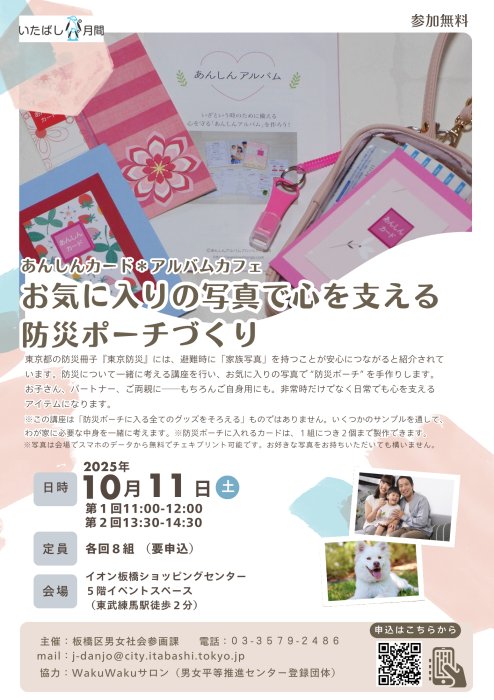 内容 | 東京都の防災冊子『東京防災』には、避難時に「家族写真」を持つことが安心につながると紹介されています。防災について一緒に考える講座を行い、お気に入りの写真で “防災ポーチ” を手作りします。 お子さん、パートナー、ご両親に――もちろんご自身用にも。非常時だけでなく日常でも心を支えるアイテムになります。 詳しくは区ホームページをご覧ください。 |