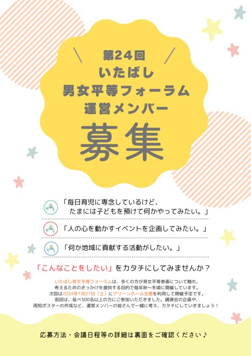 | 內容 | 舉辦板橋區男女平等論壇的目的是讓更多人有機會接觸和思考男女平等問題。下一次活動將於 2024 年 1 月 27 日星期六使用整個綠色大廳舉行。去年有300多人參加。主題演講的講師和主題的選擇、海報的製作、當天的運營方式等,與管理人員一起思考。 * 有托兒服務(適用於 4 個月至學齡前兒童) |