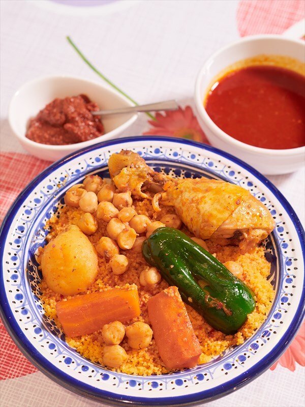 - 突尼斯菜受地中海文化影響,大量使用西紅柿和橄欖油。因為有很多穆斯林(伊斯蘭教徒),所以他們主要吃羊肉和雞肉。阿爾及利亞也像摩洛哥一樣用tagine鍋燉,與摩洛哥接壤地中海。烹飪也有各種各樣的面孔。再加上肥沃的土地太平無事,沒有經歷過現代戰爭造成的土壤污染,看來真正長出了橄欖等安全美味的農作物。突尼斯美食的特點之一是經常使用一種叫做“harissa”的調味料。以辣椒粉為底料,加入大蒜、孜然等多種香料調味而成的辛辣微酸醬汁。似乎經常在烹飪時用作調味品,即使撒在成品菜上也是如此。